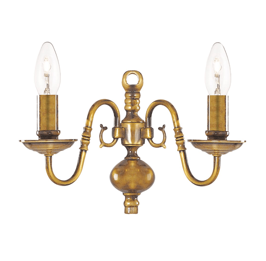 This Flemish solid antique brass 2 light wall bracket with candle style light fittings looks grand on any wall. The ornate fitting has two candle style lights and a traditional finish. It has curved arms and an ornate centrepiece with a bulbous antique brass head at its base, which adds a touch of class to any room in your home.