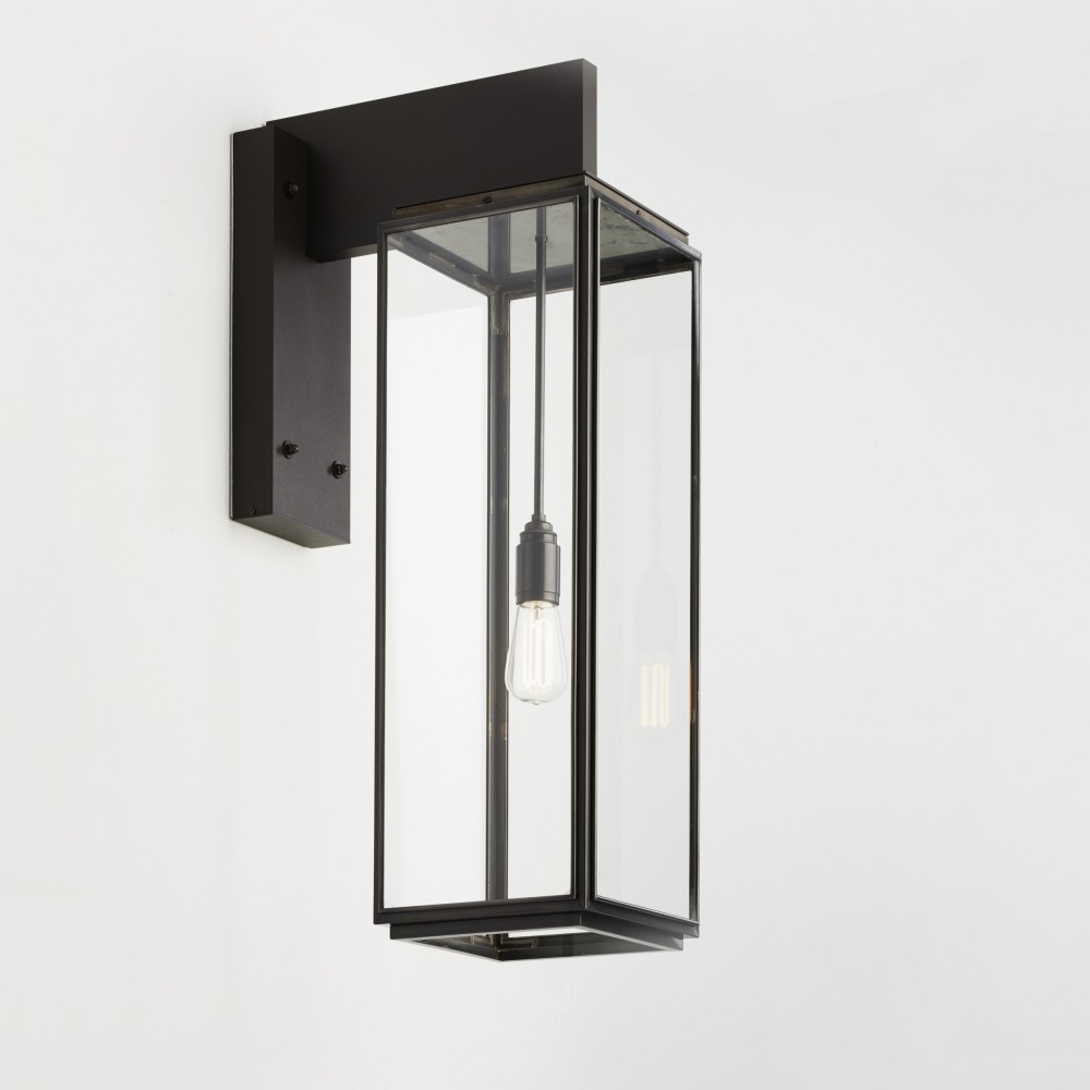 Exterior electric wall light in dark bronze with outside fitted clear glass, closed top and open bottom.
