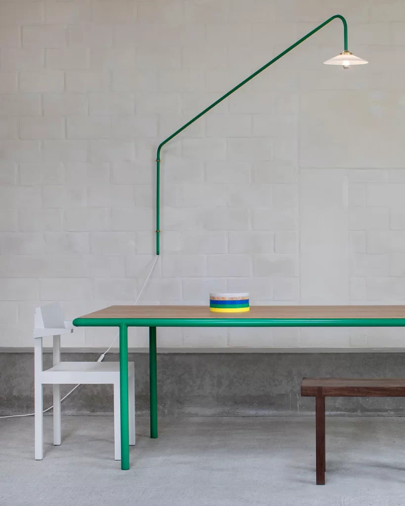 Like all Muller Van Severen’s furniture, the hanging lamps add a sober but colourful line to the interior.
