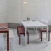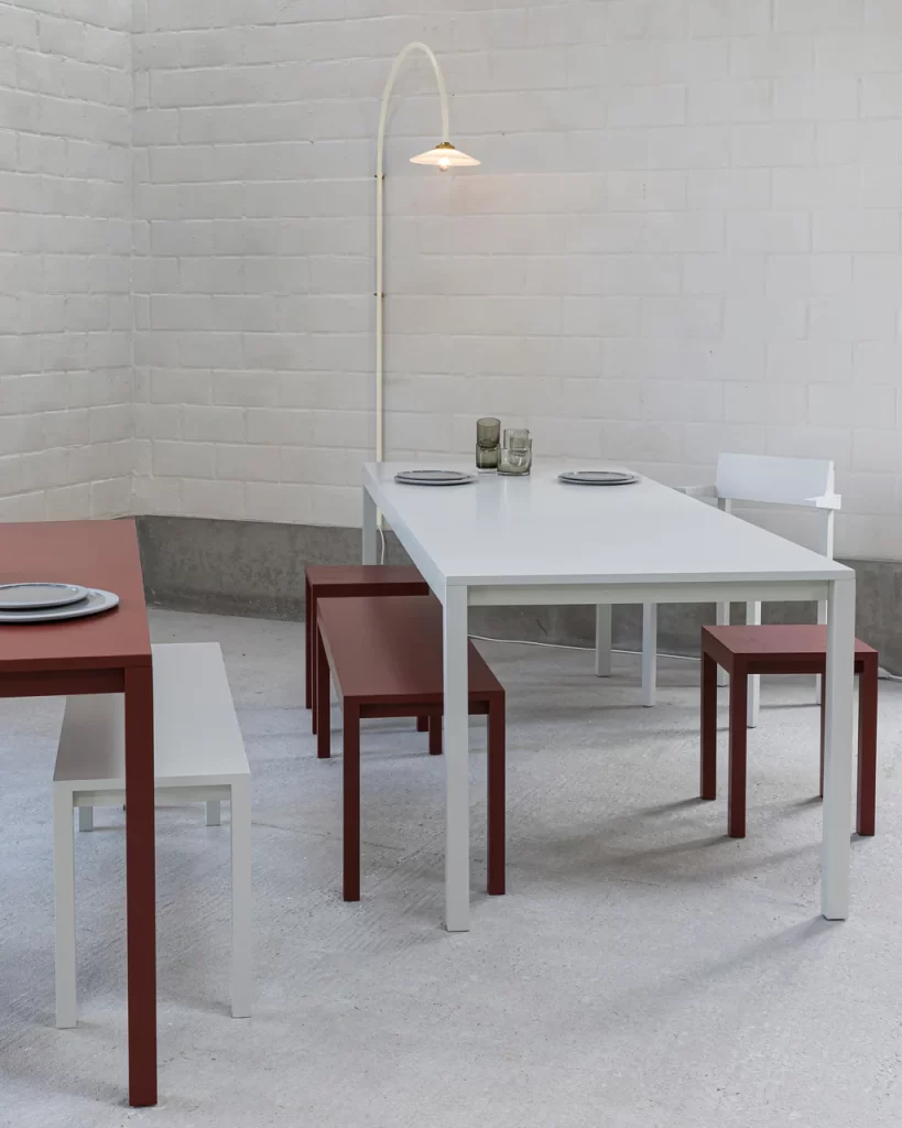 Like all Muller Van Severen’s furniture, the hanging lamps add a sober but colourful line to the interior.